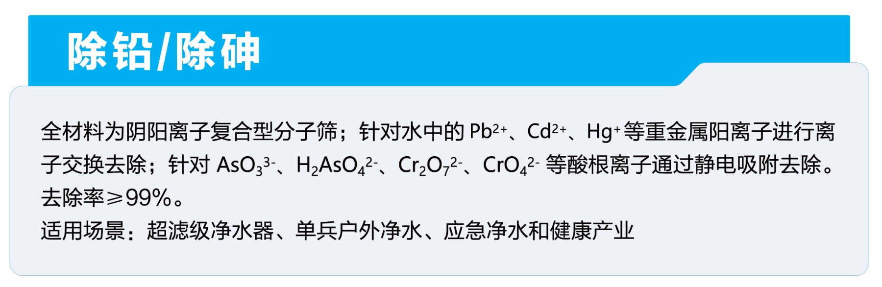 客户需求: 重金属污染区居民对铅、砷等有强烈恐慌心理。 实验室需低成本去除痕量重金属离子。 母婴群体追求“零重金属”饮水安全。 使用场景: 老旧小区改造:铅管老旧自来水系统的末端过滤。 工业区家庭:矿区、电子厂周边居民饮用水安全。 母婴市场:婴儿冲奶粉专用水过滤器。 实验室场景:分析实验用超纯水预处理。
