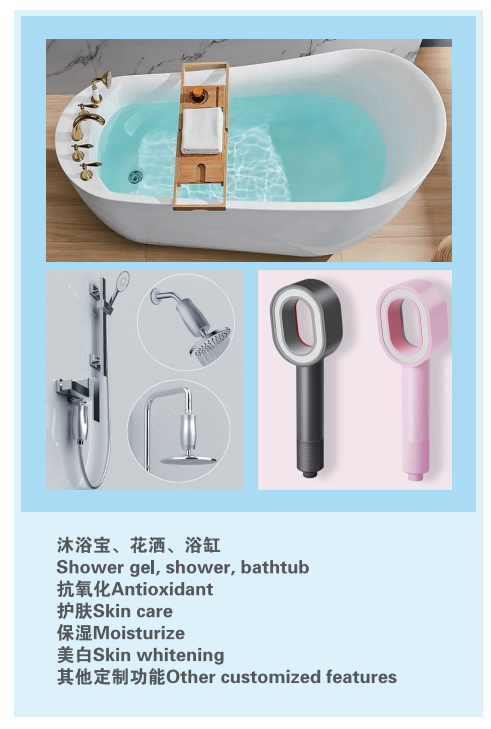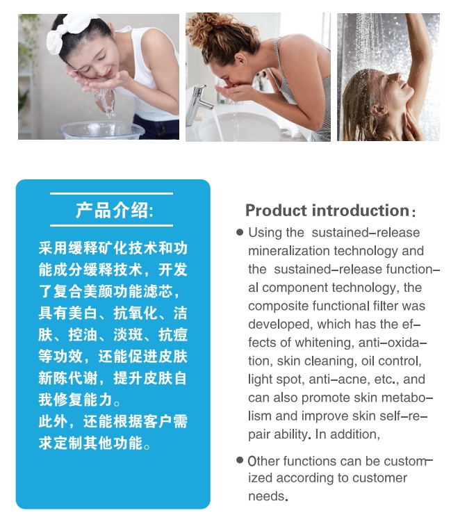 美容用户追求“以水养肤”,希望滤芯提供烟酰胺等功效成分。 宠物主人关注宠物泌尿健康(如缓释消炎成分)。 医疗机构需安全可控的抗菌冲洗方案。 使用场景: 美容仪器:蒸脸器、补水仪、智能镜子内置滤芯。 高端卫浴:护肤淋浴头、浴缸SPA系统。 宠物市场:添加维生素的宠物饮水机。 医疗康复:含消炎成分的术后冲洗设备。