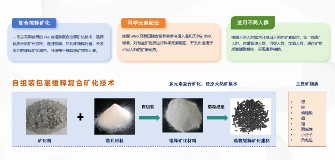 在这一领域,一号芯积极探索并取得了显著成果。一号芯采用自研的 SAE 自组装复合控释矿化技术,精心选择优质天然矿石原料,通过粉碎、活化和缓释处理等一系列精细工艺,开发出系列的缓释矿化滤料,可缓慢平稳地释放矿物质元素。依据 WHO 及我国膳食营养素参考摄入量和天然矿泉水标准,一号芯对有益矿物质进行科学元素搭配,成功开发出适用于不同人群的矿素配方。针对 “四高” 人群、体重管理人群、母婴人群、饮酒人群,通过矿物质激活酶系统,实现康养辅助的功效。