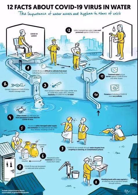 其实在疫情的发展过程中,很多人都非常关注病毒是否会跟随大自然的水循环进行迁移,巴黎的这个案例无疑会加重大家对自然水循环中的病毒传播带来担忧。近日,荷兰著名的代尔夫特大学发布了一张通俗易懂的图片,介绍了水与新冠病毒的12个事实,图中除了汇总了目前我们有限的研究对于新冠病毒的认识,也直观体现了大自然水循环中的病毒传播可能性。