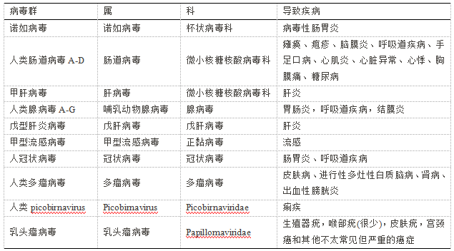 表1 显示了本综述中描述的可能通过水传播途径传播的人类病毒。