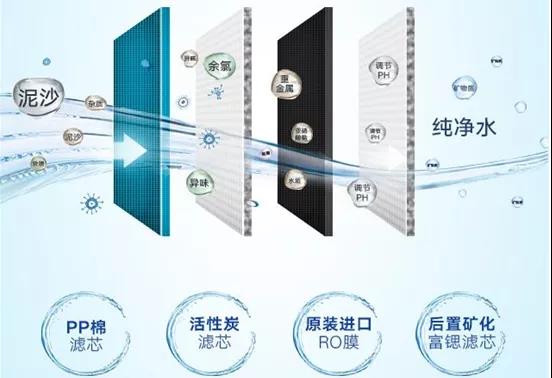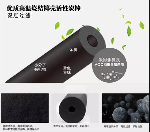 采用优质椰壳活性炭,主要功能是吸附水中余氯,去除异味异色等,当然,有很多净水器厂家很智慧的选择在活性炭里添加阻垢、抑菌或者除重金属滤料,既可以满达到直饮水标准,也可以延长超滤膜和RO膜滤芯的使用寿命,关键能提升水效。所以说,活性炭在净水器过滤系统里的作用非常重要。